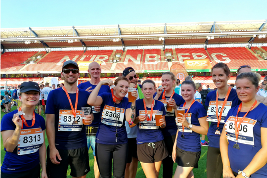 Die Anstrengung und Erschöpfung fiel von uns allen ab, als wir mit hochrotem Kopf und breitem Grinsen durch das Ziel ins Max Morlock Stadion liefen. Alle „Nicht-Läufer“ von Flutlicht begrüßten uns in einer tollen Kulisse fahnenschwenkend, jubelnd und mit unserem wohlverdienten Siegerbier – alkoholfrei versteht sich ;). Nach und nach trafen tausende Läufer in das Stadion ein, und die euphorische Stimmung steckte einfach an. Mit den Teilnehmermedaillen um den Hals und dem guten Gefühl, sein Bestes gegeben zu haben, schmeckte uns sogar das „Sportler-Bier“.